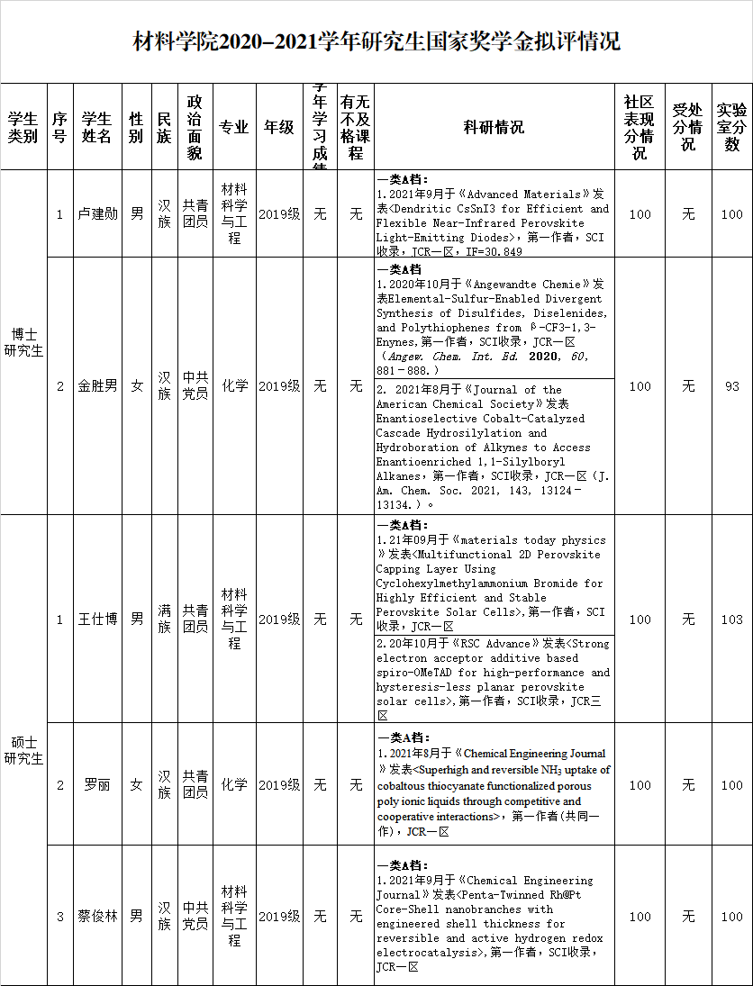 关于材料学院2020-2021学年研究生国家奖学金拟推荐名单的公示