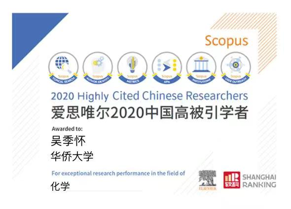 2021422日,爱思唯尔(Elsevier)正式发布2020中国高被引学者(Highly Cited Chinese Researchers)”榜单,我吴季怀教授入选“化学”领域榜单。这是吴季怀教授从2014年以来连续第七次入选中国高被引学者榜单。
