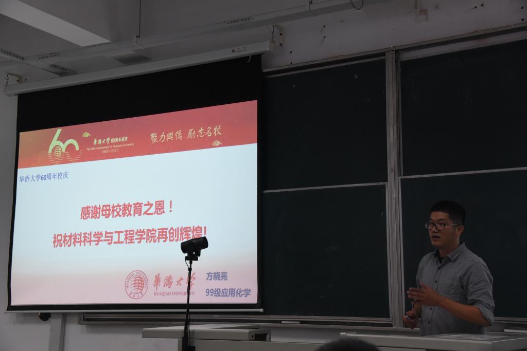 召开材料、化学优秀校友经验交流分享会。我院优秀毕业生代表78级化学系校友,材料学院原党委书记、黎明职业大学原校长林松柏教授;96级化学系校友,英国皇家化学会院士、英国华威大学荣誉教授、金之键高科董事长徐颖键教授;99级应用化学专业校友,厦门大学萨本栋微纳研究院方晓亮教授;00级应用化学专业校友,泉州半导体高新技术产业园区南安分园区管委会蔡佳荣主任;05级高分子材料与工程专业校友,厦门凯纳石墨烯技术股份有限公司洪江彬董事;08级材料科学与工程专业校友,厦门市同安区实验小学高巧文老师;14级材料科学与工程专业校友,厦门云净信息科技股份有限公司乔健通董事等优秀校友,怀着无比喜悦的心情分享交流,共叙情谊。为学院在学的学弟学妹们分享励志故事,交流创业心得,畅谈人生感悟,激励同学们做踏实有为的新时代优秀大学生。