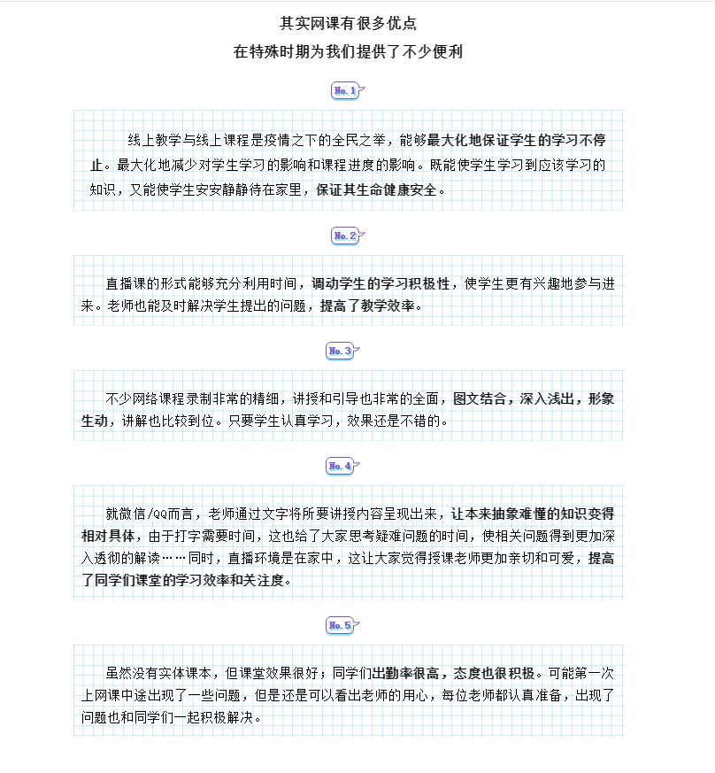 学院有序组织推进线上教学工作,学生积极反馈。在第一天线上授课后,学院教务员与各班级学生联系,及时收集学生对线上授课的意见和建议,加强对线上授课质量的跟踪,以便线上授课能达到预期效果。此外,学院辅导员、班主任通过QQ、微信、电话、短信等多渠道掌握学生的情况,与学生保持密切联系,尤其对于身在湖北和境外的学生在疫情期间的在线学习情况进行深入了解,对于他们的健康、生活情况实时跟进,并制定了相应的措施和方法,学生总体反映良好。