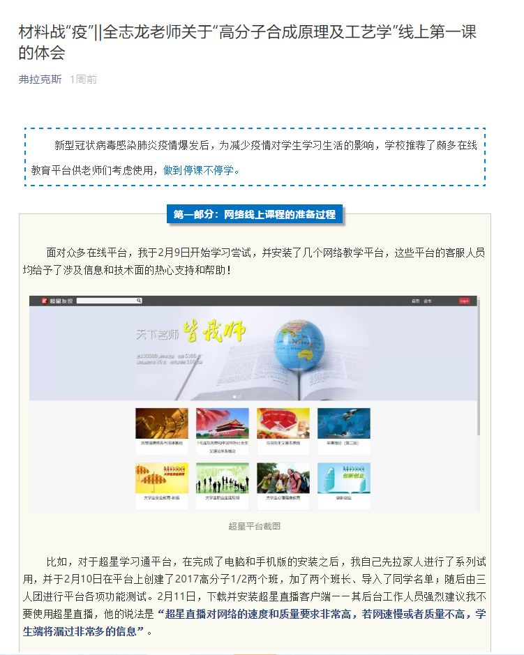 学院教师积极响应,用心投入,课前精心准备,课下深挖教学难点,以高度的事业心、责任心投入到线上教学中,保证线上授课质量。例如,高分子科学与工程系的全志龙老师在准备期间先通过下载安装不同的直播平台客户端,与相应班级班长提前联系并进行系列测试。根据各平台的设计特点、侧重点的不同,将不同平台组合应用,在线授课第一天在直播镜头下为2017级高分子1班、2班共计85名学生讲授《高分子合成原理及工艺学》这门课程。由于前期准备充分,全老师的课程进行地十分顺利。为了让其他同事更好地了解在线授课,全老师也主动将自己的授课经验与同事们进行了分享,就网络授课的要点、如何有效防止直播过程中学生流失等进行了详细的说明。