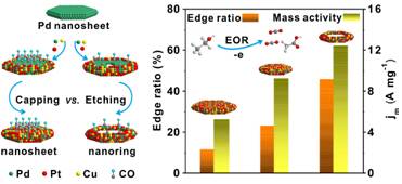 该工作中,研究人员发展了一种可控性极强的超薄二维PdPtCu三元合金纳米结构的合成方法,成功制备厚度仅为2.0纳米左右的PdPtCu纳米片和纳米环。通过对反应动力学、表面修饰和选择性刻蚀的一体化控制,实现了PdPtCu纳米片和纳米环的尺寸精准调控和形状选择。在保留组分均一性的前提下,二维PdPtCu纳米结构的边缘面积比例从11.74%逐步提高到23.11%和45.85%,为研究边缘不饱和配位原子位点的EOR催化活性提供了理想的模型催化剂体系。