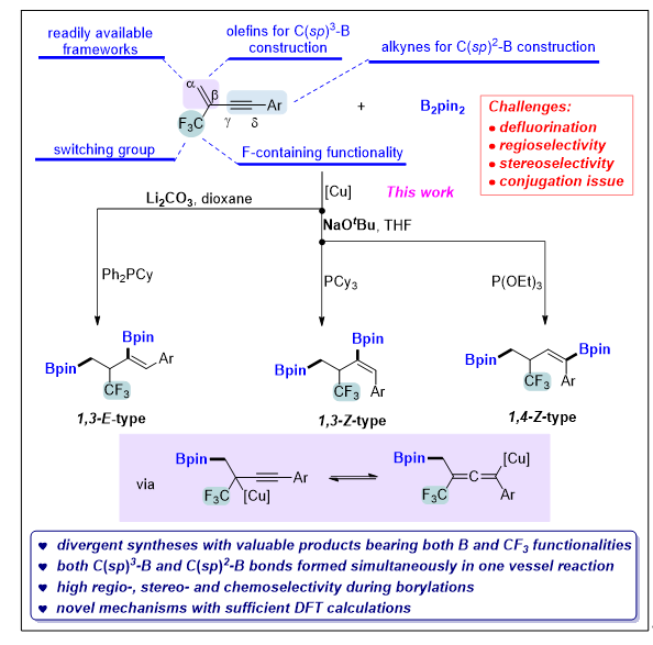 有机硼化合物是备受青睐的合成砌块。多硼化合物可以选择性地转化为多重官能团而令人着迷。不饱和化合物的硼化是构建多硼化合物最为有效的手段之一。然而,烯烃以及炔烃的硼化过程涉及的选择性问题是该类反应长期以来所面临的巨大困扰(图1A)。先前主要借助于底物的位阻效应、电子效应(导向作用)等因素来解决这类反应的选择性问题。1,3-烯炔的硼化研究,始终局限于单次硼化,一般得到丙二烯丙基硼衍生物,如何打破其共轭结构成为了一种挑战(图1B)。先前关于三氟甲基烯烃的硼化研究,一般得到氟消除的硼化产物——1,1-偕二氟烯丙基硼酸酯,如何抑制氟消除、化学选择性地保留有用基团CF3成为了另外一种挑战(图1C)。