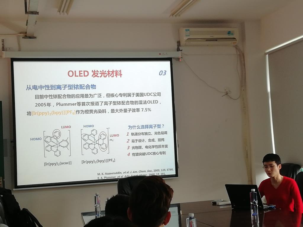 马博士在讲座中主要介绍了离子型铱配合物作为有机发光二极管的新型磷光材料。由于传统的离子型铱配合物因为具有离子特性而难以升华,无法使用真空蒸镀法制备器件,严重限制其在OLED中的应用。马博士提出并验证了一种实现可升华离子型铱配合物的通用材料设计策略:引入空间位阻大,电荷分散的四苯基硼衍生物类抗衡阴离子,有效剥弱材料的离子键,显著改善可升华性质。实现了目前报道的基于离子型铱配合物的OLED的最高性能。