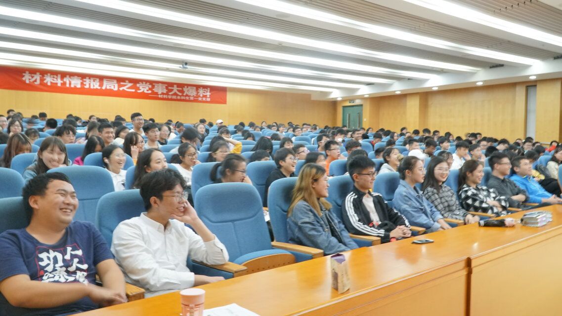 2018年12月23日晚,材料学院本科生第一党支部在G201开展了“材料情报局之党事大爆料”的入党教育宣传活动。党委秘书李振宏、团委副书记蔡建华、辅导员陈莹出席,学院2018级全体新生、2017级入党积极分子参与活动。