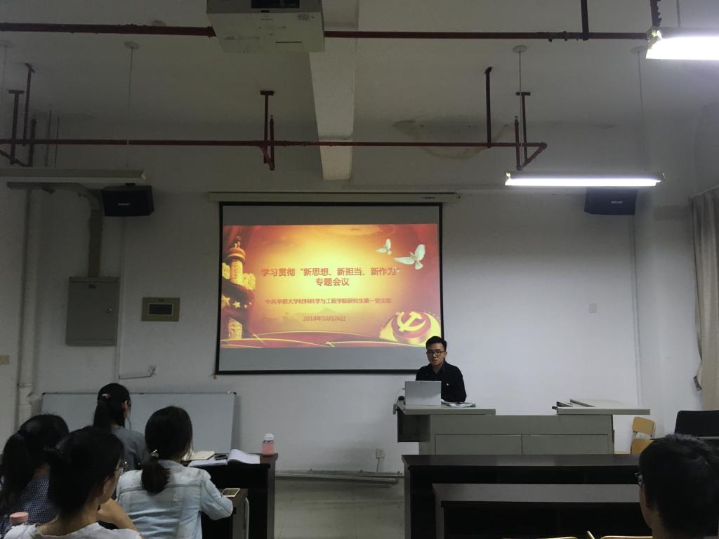 会议初始,廖世昌为大家介绍了“新思想”的由来和重要性,集中观看“新时代来啦”、“梧州新时代新青年新担当”等视频,加深与会同志对“新思想、新担当、新作为”的理解。随后,与会的党员和入党积极分子针对“作为一名研究生党员,如何学习贯彻“新思想、新担当、新作为”发表了自己的见解。其中,张睿聪认为,在学习“新思想”的过程中不要忘记已经学习过的“旧思想”,“旧思想”是一名党员学习“新思想”前应该基本掌握的知识点,“旧思想”是 “新思想”的前提和基础,“新思想”是“旧思想”的完善和提高;张海林结合自身经历讲到,在实验上,要把握好挑战一些有难度课题与“不痛不痒”课题之间的平衡,要注重实验室的内部建设与协助配合班委做好工作;入党积极分子朱前进认为,目前理论知识与实际运用间还存在不同步现象,要不断努力将学到的理论应用到实际。