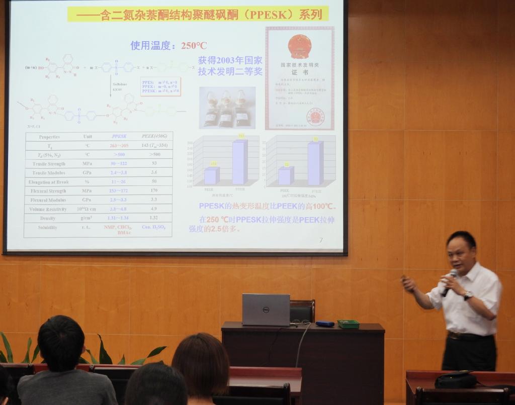 陈晓峰教授主讲的“新型微纳米生物活性玻璃研究及应用进展”,从生物医用材料的大背景出发,进一步阐述了生物医用材料在组织修复中的作用,最后讲述生物活性玻璃的研究现状和前景进行了展望。中国工程院院士蹇锡高院士主讲的是“新型杂奈联苯高性能高分子材料及其应用研发进展”,报告从高性能工程材料在军工产业中的应用为切入点,阐述了传统高性能工程材料存在的问题,针对存在的问题阐述新型杂奈联苯高性能高分子材料的优异性能。