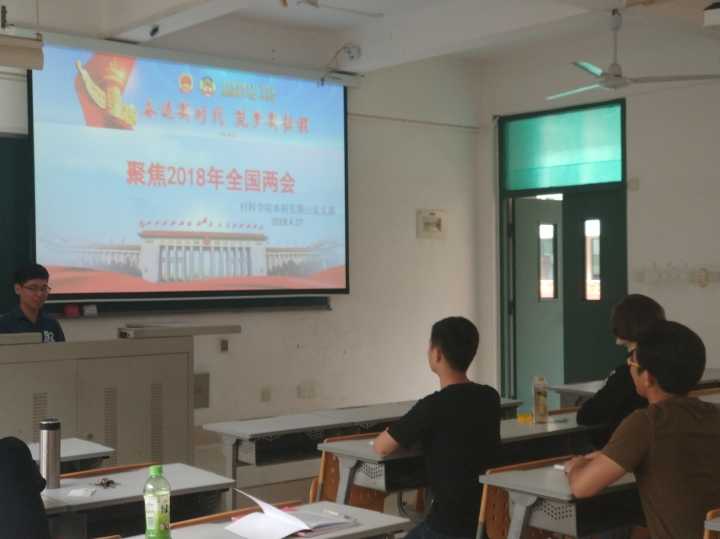 本科生第三党支部在D1-202开展主题党日活动,活动以学习2018年全国“两会精神”和“洁洁良”事件为主题,由党支部成员陈杰同志主持。