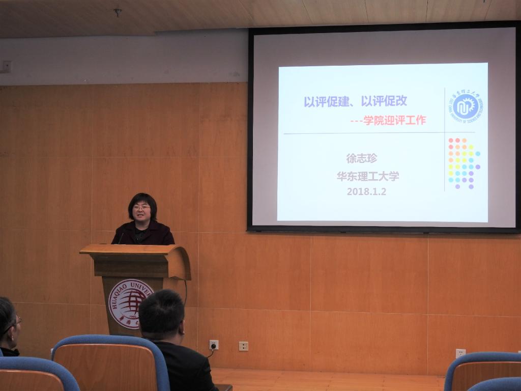 徐志珍主任在报告中详细剖析了本科教学工作审核评估中学院要做的具体工作,主要包含学院评建工作分工、评建材料的准备和梳理、学院汇报及评估会务接待等。