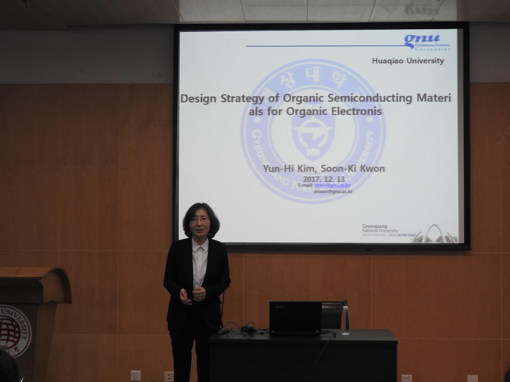 Soon-Ki Kwon教授课题组长期从事应用于有机电子领域的有机半导体材料的开发设计等研究,截止目前发表期刊论文180余篇,在国际顶尖期刊Science, Nature, Advanced materials, JACS等期刊上发表近二十篇论文。报告中,Yunhi Kim教授主要介绍了应用在有机场效应晶体管(OFET)的功能高分子材料的设计, 合成及其相关的器件性能研究。师生们认真听取了学术报告。并且在最后的讨论环节,就聚合物主链或侧链的单元选择及修饰对聚合物性能的影响等问题,Yunhi Kim教授进行了耐心细致地讲解。