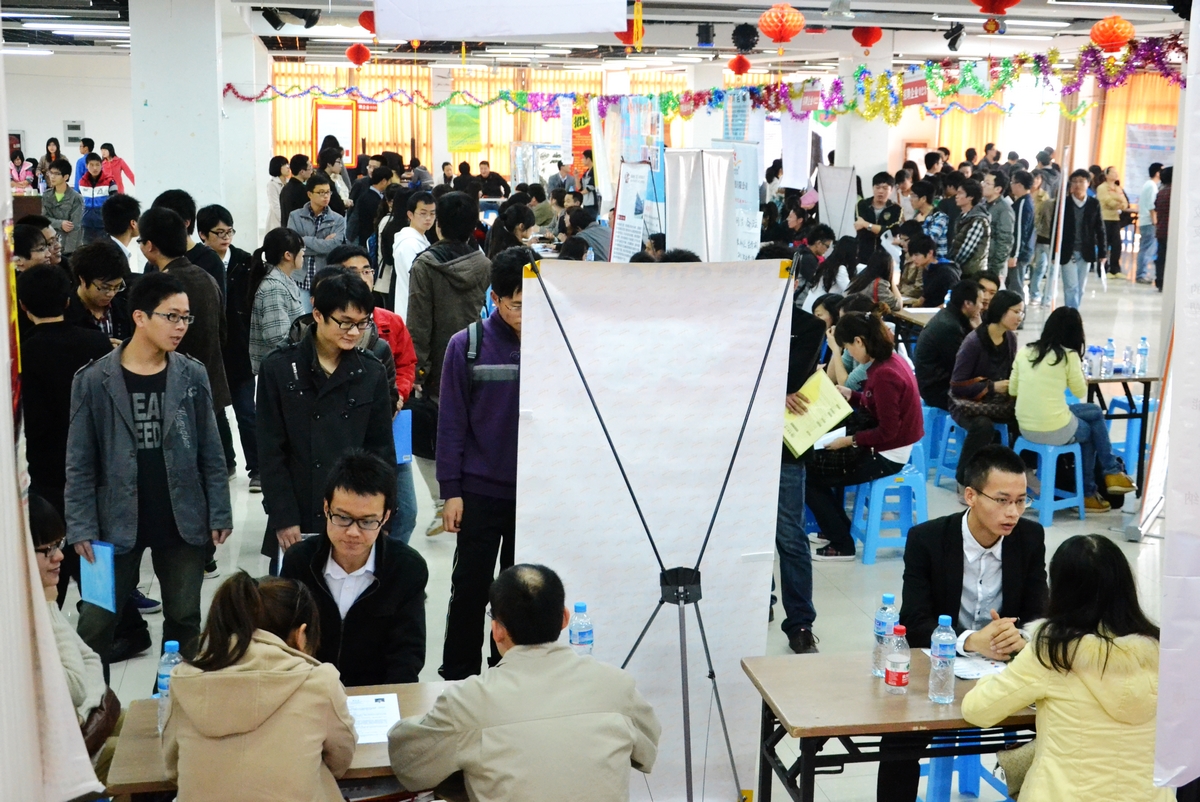 招聘会开始前,各用人单位在学生志愿者的引导下顺利悬挂招聘海报并在固定位置落座。下午1点半,招聘会正式开始。来参加招聘的同学络绎不绝,现场人头攒动,整个会场十分热闹。随处可见三五个同学聚在海报前交换意见,或手捧求职材料排队等候与用人单位面试,用人单位也怀着求贤若渴的心情认真耐心地接待每一位前来应聘的同学。据现场采访,很多毕业生表示,此次招聘会企业普遍较好,并且专业对口,给他们提供了很多选择的机会。