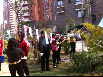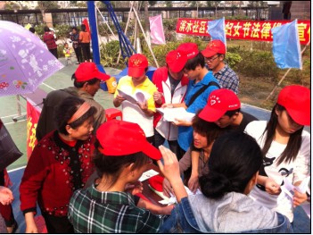 下午2时许,志愿者到达滨水社区,在社区工作人员的帮助下,迅速搭建好了活动场地,场地分成三大功能区:义诊现场、法律有奖知识问答和兑奖区。为了让活动更有意义,学院青协主动联系卫生服务中心,邀请他们为社区居民进行免费体检,宣传预防肺结核的知识。同时志愿者们设计用以“猜灯谜”的形式向社区居民普及法律知识,志愿者们将写有法律基础知识的问题纸条贴在场地四周,居民可以任意选择一道问题进行回答,答对即可获得丰厚奖品。活动现场,居民参与热情高涨,义诊区体检、问答区答题的居民络绎不绝,曾一度出现排队的火爆场面。志愿者们也积极参与其中,校对答案,维持现场的秩序,分发集美区妇联提供的普法传单和奖品,每一个岗位上都能看到志愿者的身影,骄阳当头,志愿者们还为社区的老人撑起一把把遮阳伞,扶着参与活动的老人去领奖,老人脸上挂着开心的笑容。
