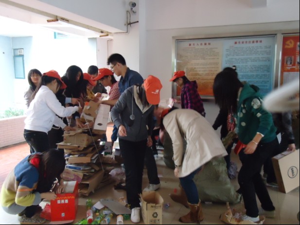 新学期新气象,2月14日中午,我院青年志愿者协会组织开展了“新学期,新环境”宿舍废品爱心回收活动,参与志愿者达97名,最终所得钱款将全部用于志愿服务以及公益活动。   天公不作美,当天中午时分天空下起了雨,但是志愿者们依然准时集合在指定地点,并且很快地投入到了志愿服务中去。宿舍楼中、宿舍楼前到处是志愿者们服务的身影,他们不怕脏,将收回的废品分类整理,他们不怕累,冒着大雨一趟趟地将废品搬至回收站,他们不怕疼,有的志愿者手上都被编织袋磨得通红,却依然不肯让别的志愿者代替,他们用自己的无私付出,彰显了材料学院志愿者的熠熠风采。此次活动在周二卫生大检查之前开展,帮助同学们及时清理了宿舍废品,同时变废为宝,为今后的志愿服务筹得了230元的公益资金。   材料学院青协一直致力于为同学们打造一个良好的志愿服务平台,让同学们在志愿服务中,磨练自己,发现自己,实现自己。本学年,学院2011级新同学中又有230名同学加入了志愿者的大家庭,为发展学院志愿服务,提供了新的强大动力。