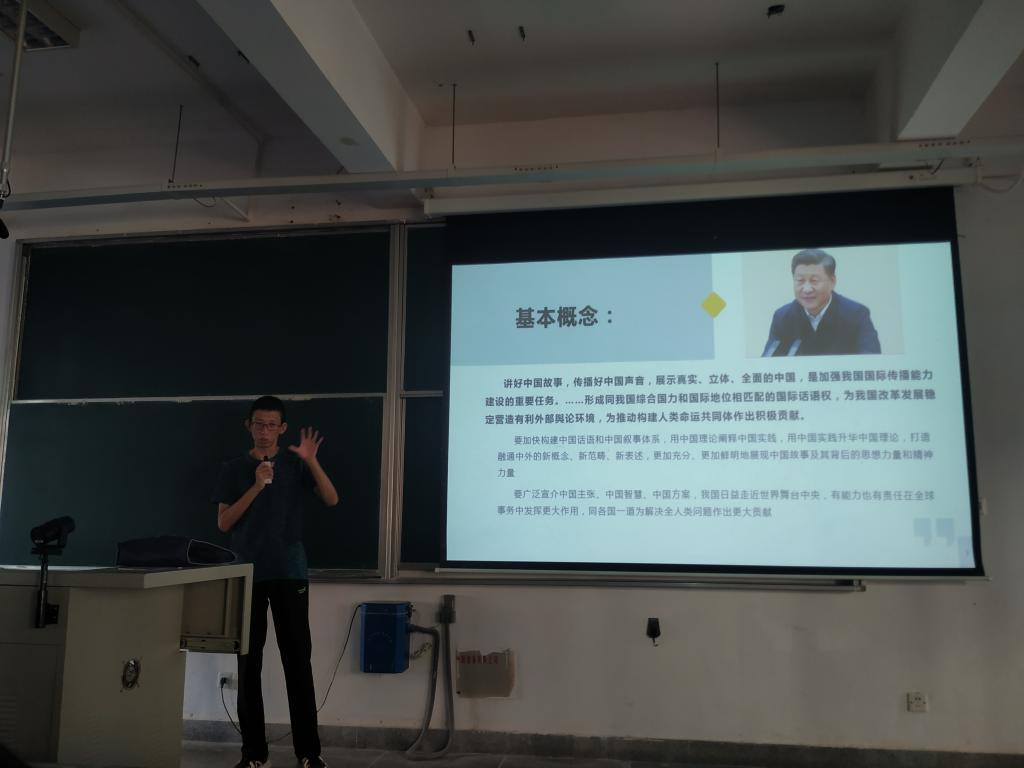 随后,学院邀请学校宣讲团成员、马克思主义学院乔楚为大家带来“如何讲好中国故事”专题讲座。乔楚引用习近平总书记的重要讲话,介绍讲好中国故事的重要意义。他通过例举事例,帮助大家正确理解“讲中国故事不等于讲中国文化”。他强调,我们拥有讲好中国故事的丰富资源,主动讲好中国治国理政的故事、中国人民奋斗圆梦的故事、中国坚持和平发展合作共赢的故事,利用好这些资源和素材讲好中国故事和展现中国形象,加深世界对中国的了解,增强各国对当代中国改革发展的认识,生动展现一个和平发展、多姿多彩、文明进步的中国。