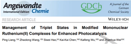 5月23日,我校发光材料与信息显示研究院、韩国直播 陈凯凯博士、魏展画教授团队联合大连化物所吴凯丰研究员团队,在国际知名期刊《德国应用化学》上发表题为Management of triplet states in modified mononuclear ruthenium(II) complexes for enhanced photocatalysis的研究论文,韩国直播 硕士研究生梁平、大连化物所博士研究生王朝龙为论文共同第一作者,陈凯凯、吴凯丰、魏展画为论文共同通讯作者。