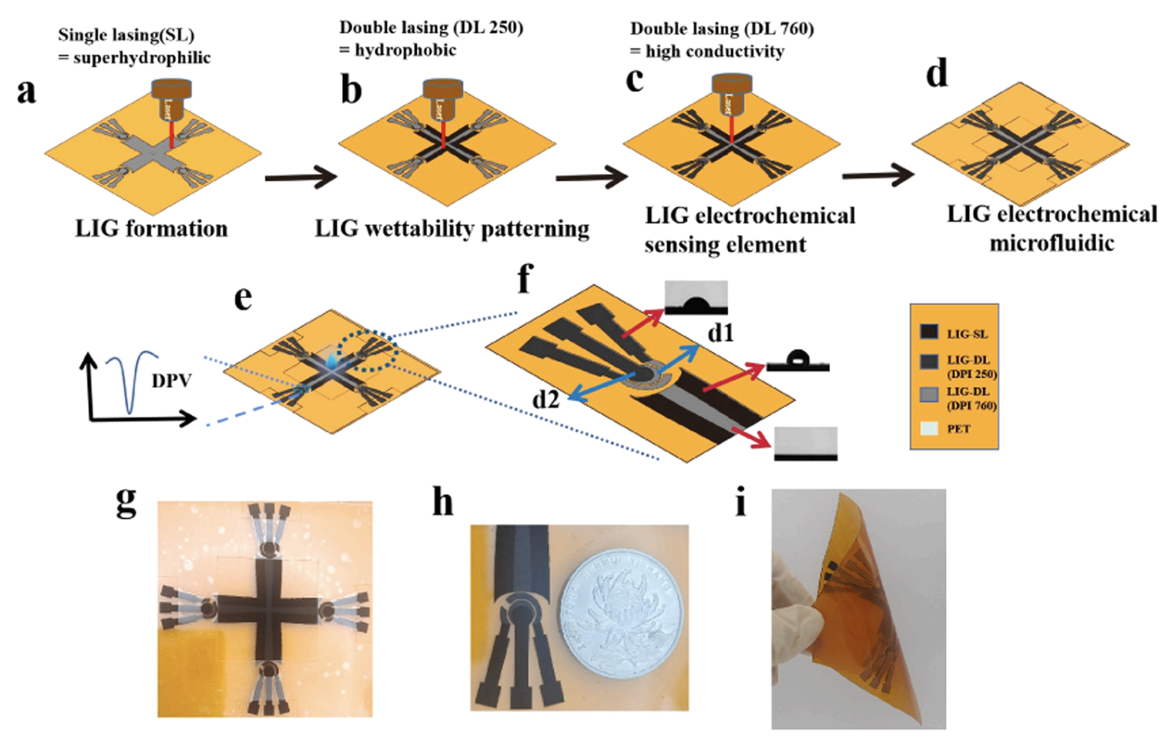 无需外部泵源和供给能即可实现流体传输的无泵表面流体传输技术在电分析领域受到关注,然而在单一材质上同时实现微流体控制和电化学元件集成的一体化芯片研发具有较大的挑战性。在此,我们借助微米级光斑的CO2激光器制备了微流控功能化的激光诱导石墨烯(Laser-Induced GrapheneLIG)电化学传感器。该工艺通过聚酰亚胺(Polyimide, PI)柔性材料的原位、无掩模、快速激光刻蚀成型,充分发挥了可编辑模版化的多样性优势。灵活调控激光参数,无需后期化学修饰即可制备不同电导率、表面形貌和表面润湿性的LIG界面,有效规避了传统修饰电极多步处理的繁琐操作和耗时的表面修饰过程。基于激光调控高效模板化工艺,我们制备了一种新型的LIG无泵开放式微流控电极芯片用于构建高通量电化学传感平台。该传感平台能够快速均分样品并输送到四个可寻址处以实现单芯片的多次平行测试,联用差分脉冲伏安法(Differential Pulsed VoltammetryDPV)可实现多巴胺(DopamineDA)和尿酸(Uric AcidUA)的同时检测。该LIG电极芯片对DAUA的线性检测范围分别为0.91 ~ 171.15 μM0.83 ~ 250.04 μM,检测限为72 nMDA)和48 nMUA)。双靶标同时存在时对DA检测无影响,而UA的检测限上升了一个数量级。此外,该电极芯片具有出色的选择性,不易受同类型小分子的干扰,在人体血清样本中检测,得到了良好的回收率,且稳定性可靠。实现了LIG电极芯片的30次可逆使用,数据重现性良好,DAUA的芯片重复使用RSD分别为4.54%8.49%。综上所述,免修饰激光诱导石墨烯电极芯片传感技术为临床诊断中生物分子的快速检测提供了一种微型便携、高效易用的电化学分析新方法。